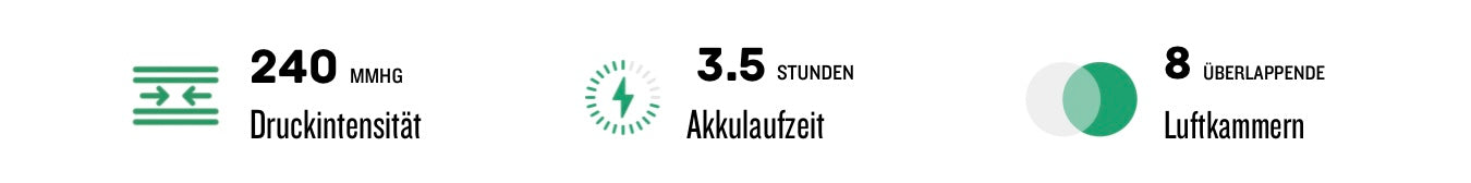 8-Kammer-System: Sequentielle Kompression vom Fuß bis zur Hüfte für optimale Durchblutung und Muskelregeneration.